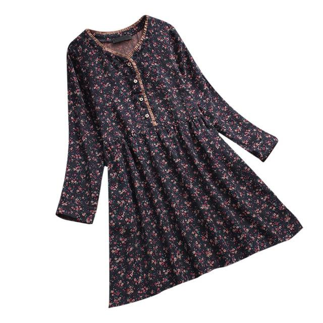 Summer Dress Women Ladies Floral Print Causal Long Sleeve Loose Dress Button Cotton Line Party Dress Vestidos Mujer Robe Femme